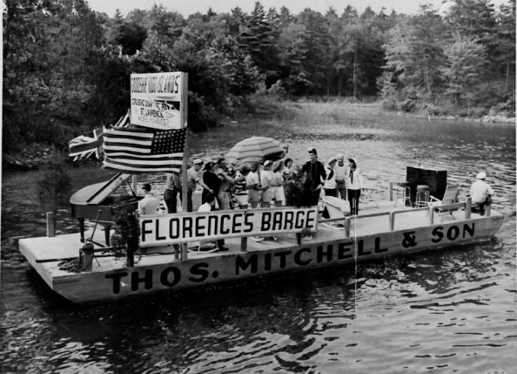 Mitchell owned the island and never conveyed it to Godfrey, but it made for good publicity. Mitchell even outfitted his brother Thomas’s construction barge with a grand piano, decorative banners, U.S. and British flags and a handful of models, and dubbed it Florence’s Barge. The barge was towed among the islands, but there was no record of Godfrey participating, although he was said to have struck up a friendship with Mitchell and made a few visits to the Monticello.
