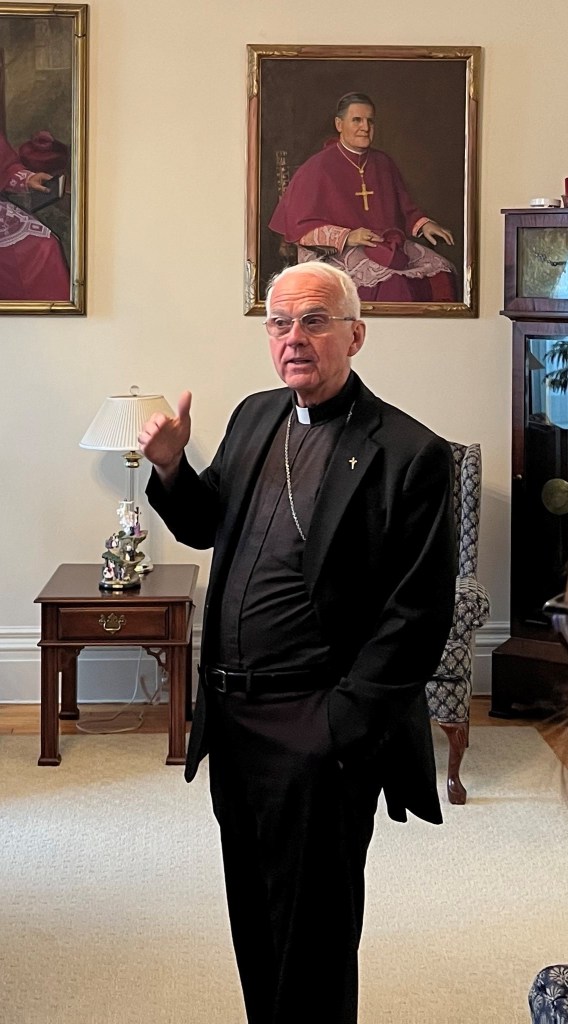 The bishop showed us his office, kitchen, chapel and living room adorned with portraits of past bishops such as Wadhams, Brzana, Lovato and Cunningham. He shared cookies and lemonade in the dining room. But he was at his best, charming, friendly self in the foyer where he pointed at portraits of himself and Pope Francis.