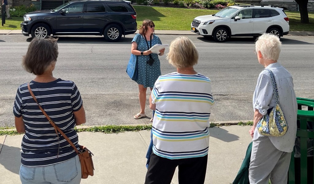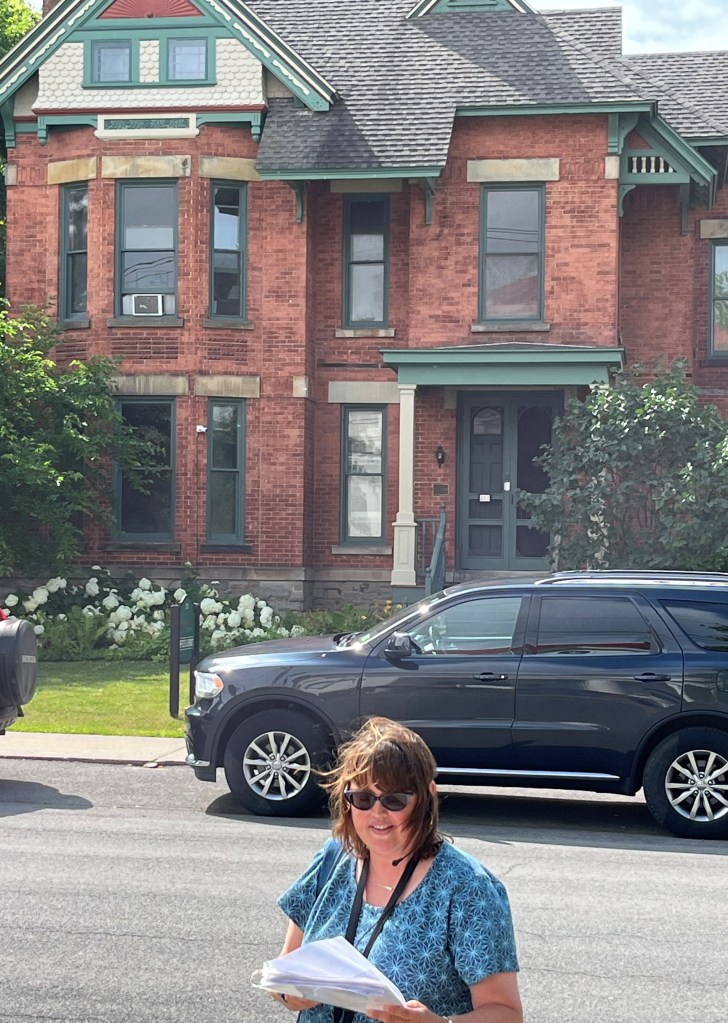 Her tour begins on the steps of the Ogdensburg Public Library where she explains the architecture of the Greek Revival structure, its past ownership and its transition from homestead to library.
