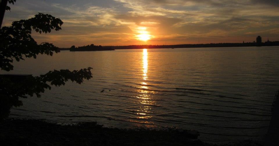 The mile-wide St. Lawrence River at sunset with Old Man’s Island at left and Brockville, Ontario, at right. (Photo courtesy of Lois Langtry)