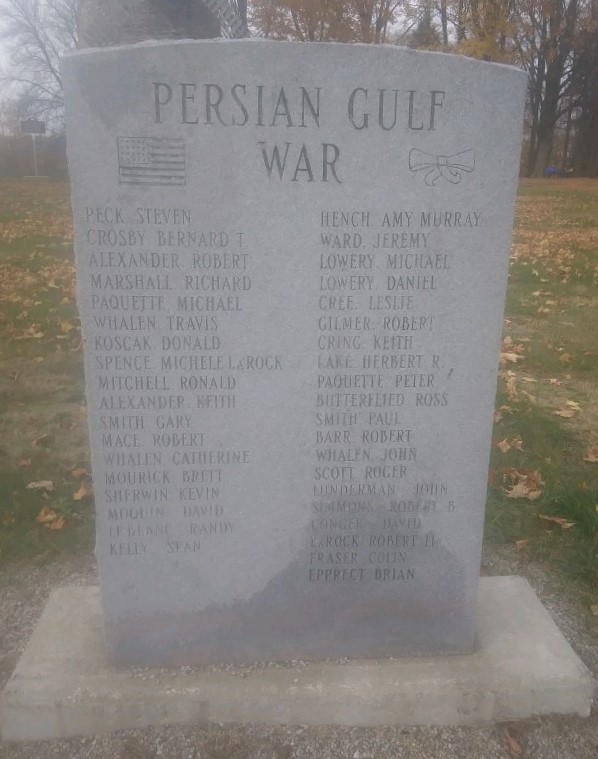 On these stones are carved the names of those who served. Last names that still live in the community – Colby, Cree, Lowery, Moore, Moquin, Newby, Paquette, Whalen, Woodcock and Wright – are inscribed underneath the conflict in which they served: Gulf War, Vietnam War, Korean War, World War I and II, all the way back to the Civil War. Northern New York communities do remember, and do appreciate, their veterans and the fallen.
