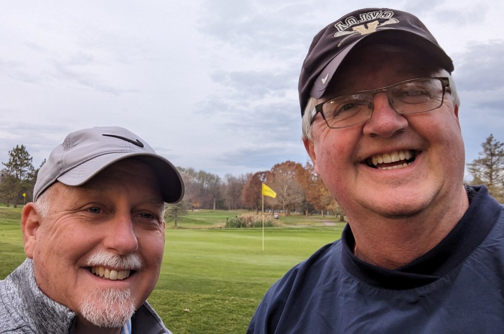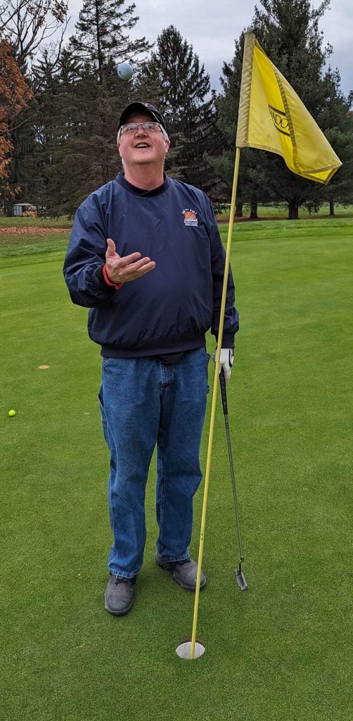 All this hilarity was interrupted by my approach on the 13th hole. I lobbed a wedge shot to the middle of the green and watched the ball disappear down a slope. I couldn’t find it. On a lark, I checked the cup. Yep, birdie! What a way to close the season. An 85 was a great improvement over the epic meltdown I had in the climactic league tournament, shooting about 110.