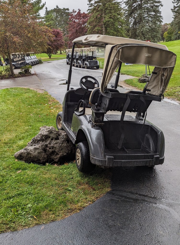 I recalled how weeks earlier a distracted golfer crashed a cart on the boulders outside the pro shop. The cart was suspended about a foot off the ground until it was freed. The suspension was damaged, but she wasn’t charged because the club made considerable money off her dinners and greens fee.