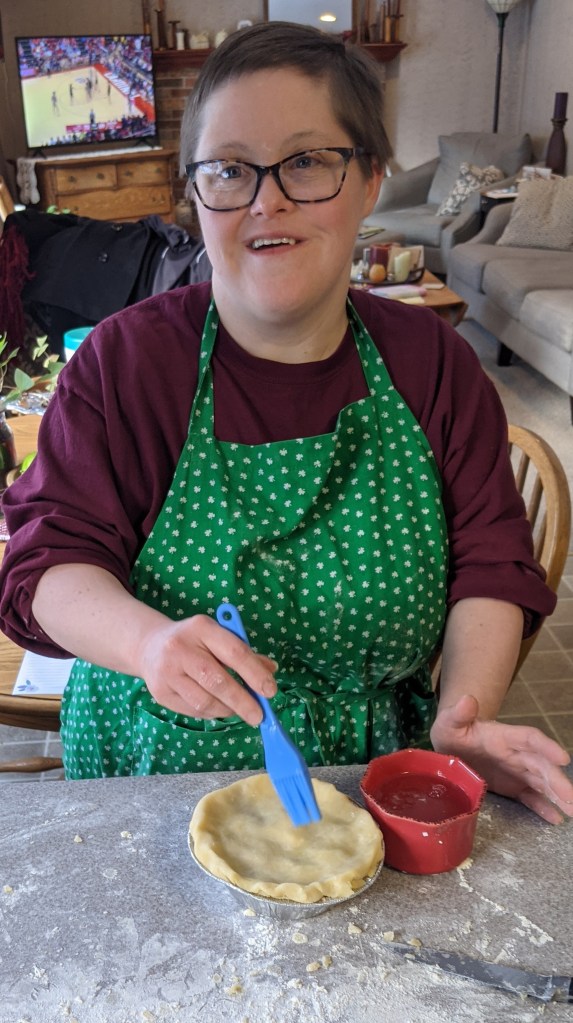 Kathleen Holleran brushes egg whites onto apple pie crusts. She also helps deliver pies to persons who have lost a loved one, undergone a medical procedure or need a boost.