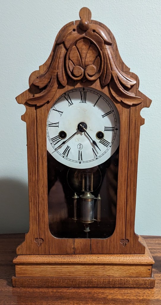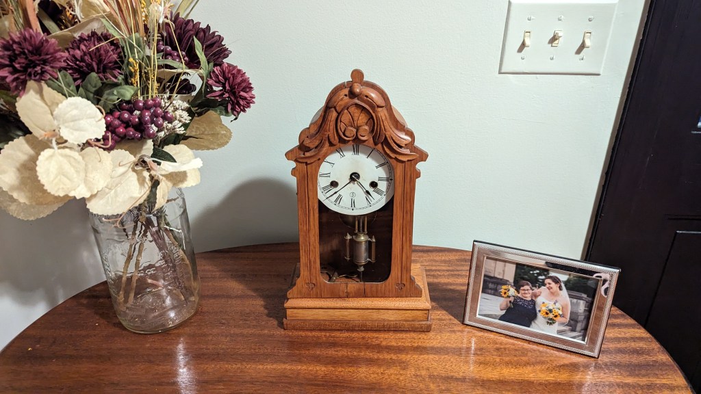 Mary spotted it first; it was like a beacon from the shore on a moonless night. There stood my mother’s tabletop clock. She probably discovered it during one of her tours of North County antique stores, or maybe it was a gift from her buddy, Fr. James Meehan of Alexandria Bay. Upon her passing, the clock spent the last 25 years at Aunt Helen’s home, a gift from her beloved sister.