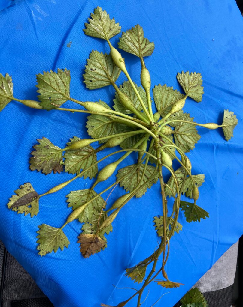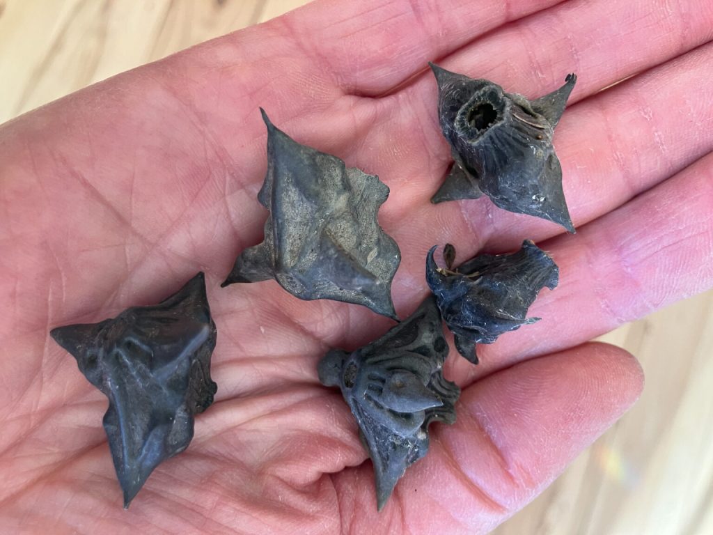 Water chestnuts contain green clusters of floaters spreading out to toothed, triangular leaves. The plants gather nutrients from a central stem extending to sediments along the water’s bottom. Beneath the floating clusters are four-pronged nuts that fall off in 2-3 weeks. Eventually, the nuts can develop 10-20 more nuts. The growth is exponential. The nuts cling to boat lines and float with currents. They have reached Eel Weir State Park, and Baldwin believes the nuts have been tumbling downstream for the past four years to Ogdensburg, perhaps as far as Massena. There was a sighting of water chestnuts at Tibbetts Creek in Lisbon.