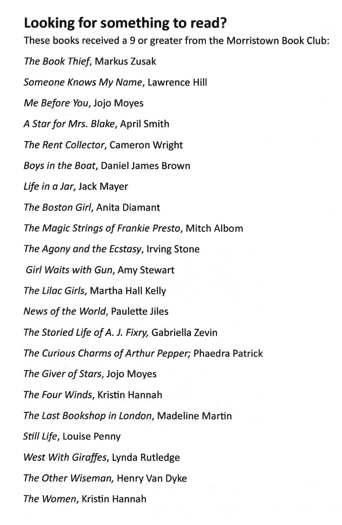That’s the kind of energy that the Morristown Book Club brings to its monthly gatherings. These meetings aren’t an excuse to drink coffee and graze on finger foods. Titles are vetted, characters are analyzed, plots dissected and books are rated.