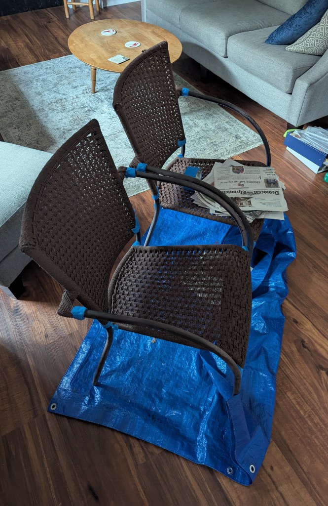 Now that we have assumed leadership of Blessed Sacrament’s Next-To-New Sale, our garage has become a mini-warehouse. We have two Adirondack chairs that need a paint job, a plastic basketball hoop, five patio chairs, more toys and an Ethan Allen solid maple bed frame. Our two-car garage now holds only one — the Gramvan. My truck has been relegated to the elements. As I write this, Mary is taping the seats of two patio chairs in the middle of the living room so she can take them to the garage for spray painting.