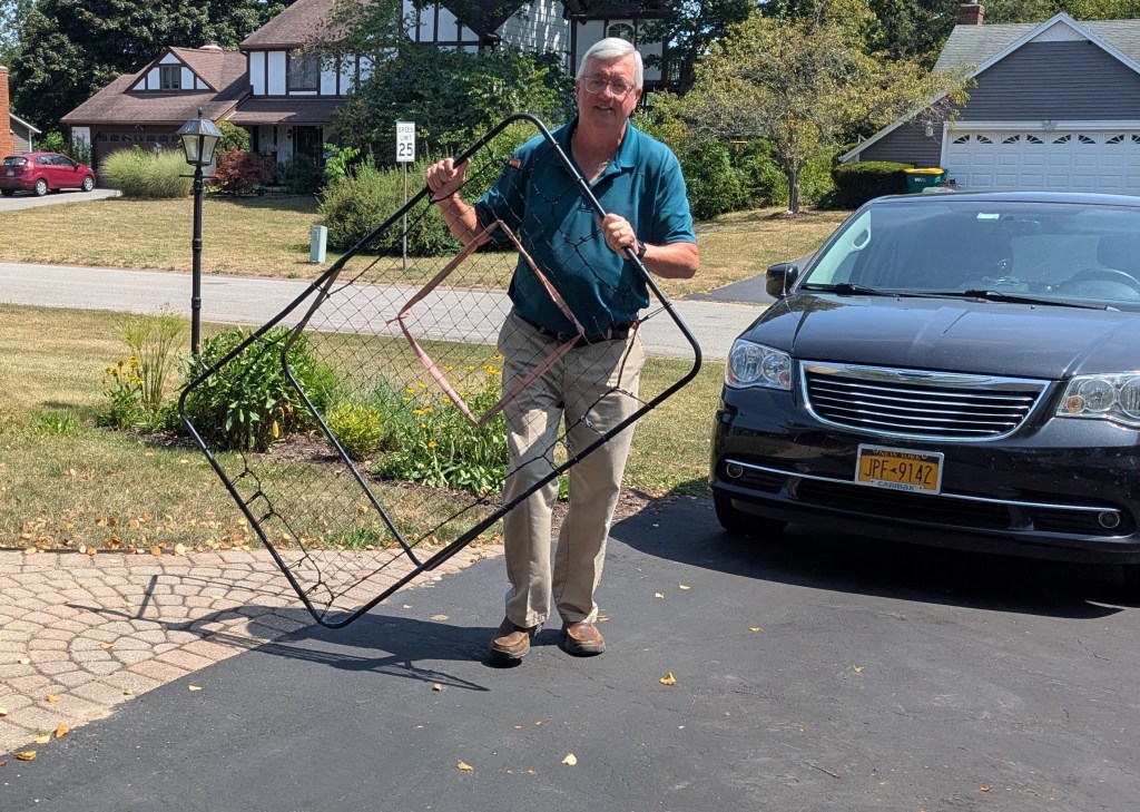 As we drove home from Mass on Sunday, I was puffing up my ego, teasing Mary about searching for roadside treasures, when I was immediately humbled. I spotted a pitchback – a framed net that rebounds whatever ball you throw. Brainflash! I could improve my lame throwing for senior softball. I wouldn’t have to ask the neighbor girl to play catch – my wild throw last time dented our mailbox. So we stopped the car and brought it home.