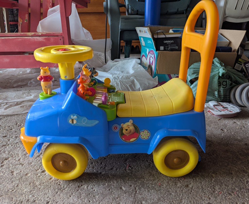 This fine mess started innocently enough when Mary and I found a common interest in antique stores. She was intrigued by garage sales, then added thrift shops. Now that we are grandparents, no stone or curbside pile goes unturned. On various jaunts, she spied a chalkboard, Little Tikes Cozy Coupe and plastic baby swing, all with our grandson Wesley James in mind.