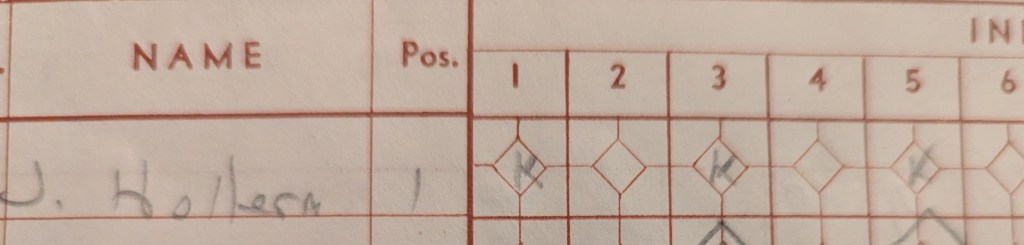 I flipped to the middle of the scorebook and by some act of God landed on one of my games for Perretta Packing vs. Spilman’s. Again, there was a roster of former MCS players in their formative years. Herbie Lake, David Johnson, Harlow Hockey, Bruce Hubbard. Plus Norman Roach, Bob LaClair, Frank Perretta and Greg Sargent.