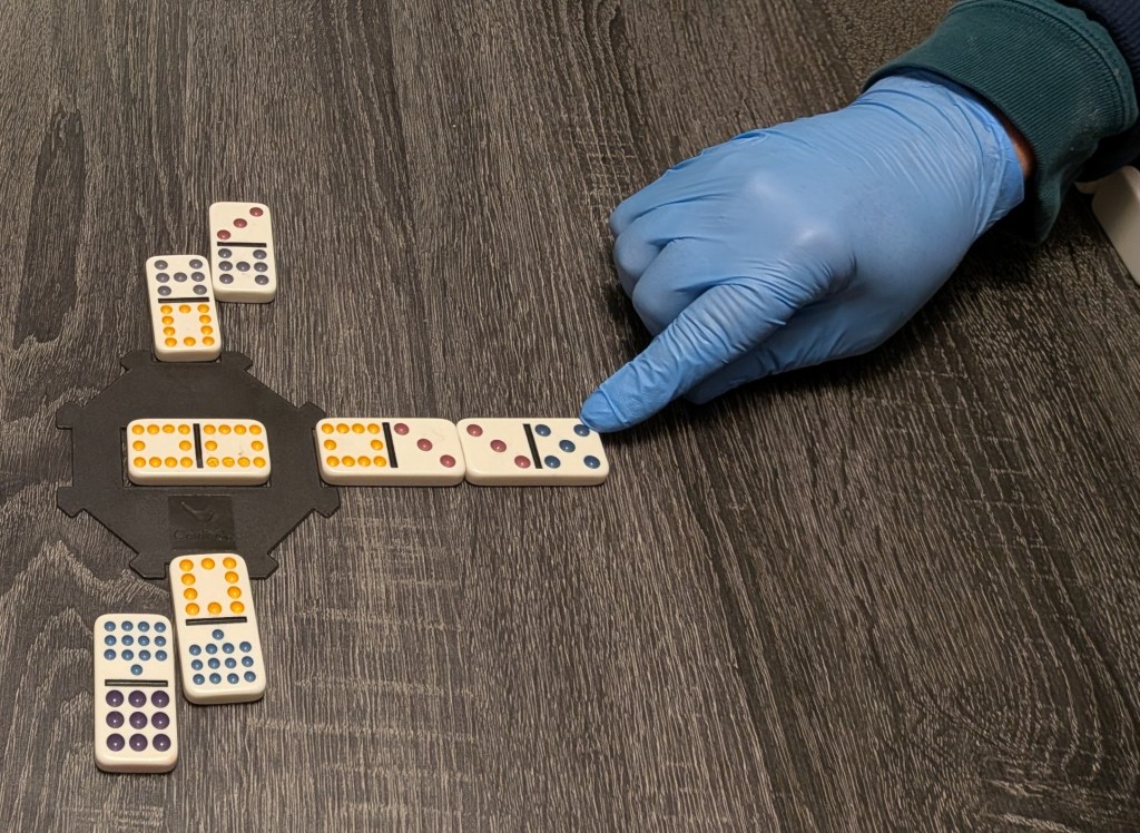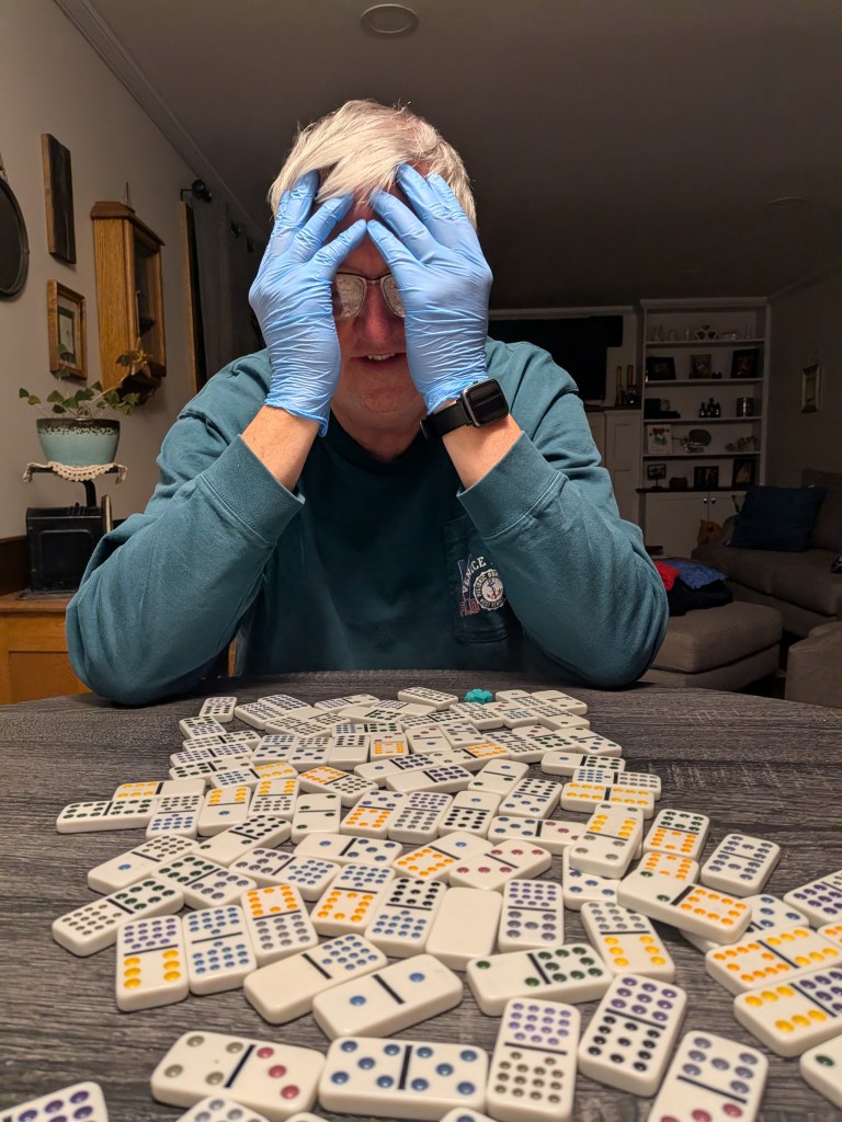 With Katie and Liam home, evenings call for a family dominoes game. To stop the spread of pink eye and Mary’s ailments, we wear disposable gloves. The games resemble family night with the Blue Man Group.