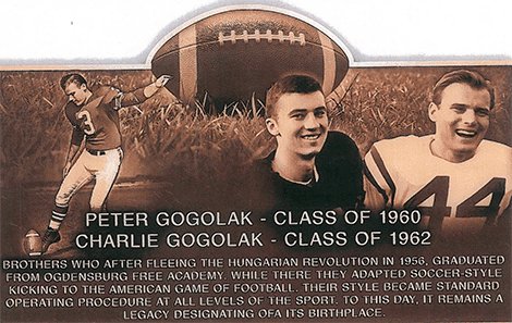 Ogdensburg became the birthplace of the soccer-style kicking movement in the NFL in the 1960s. Before Pete Gogolak came along, all kickers used a straight-on approach.